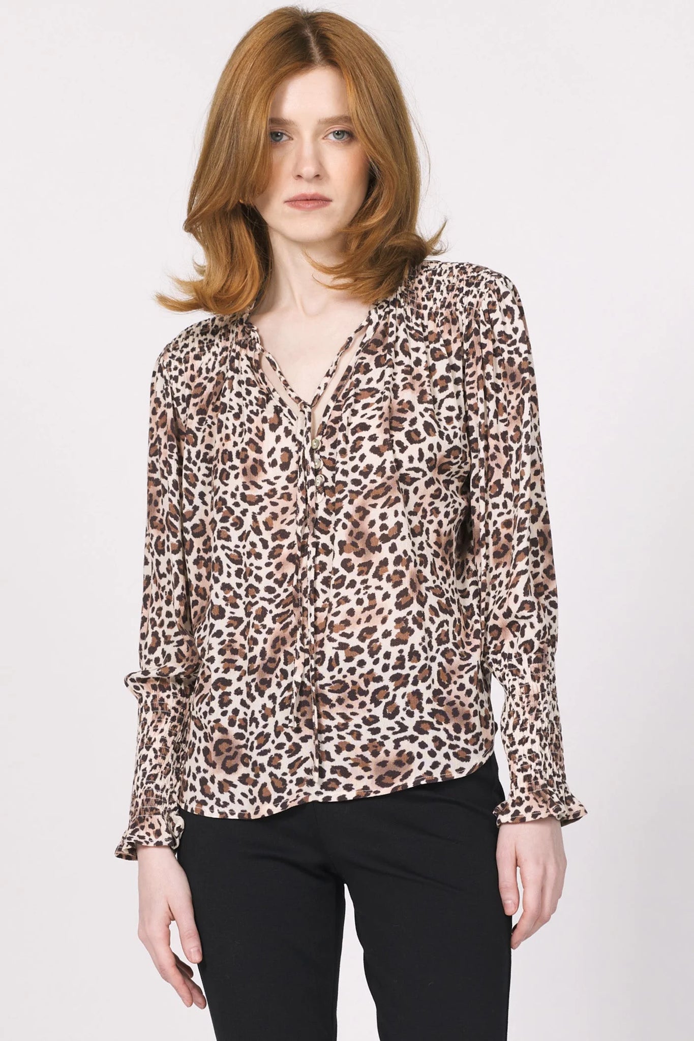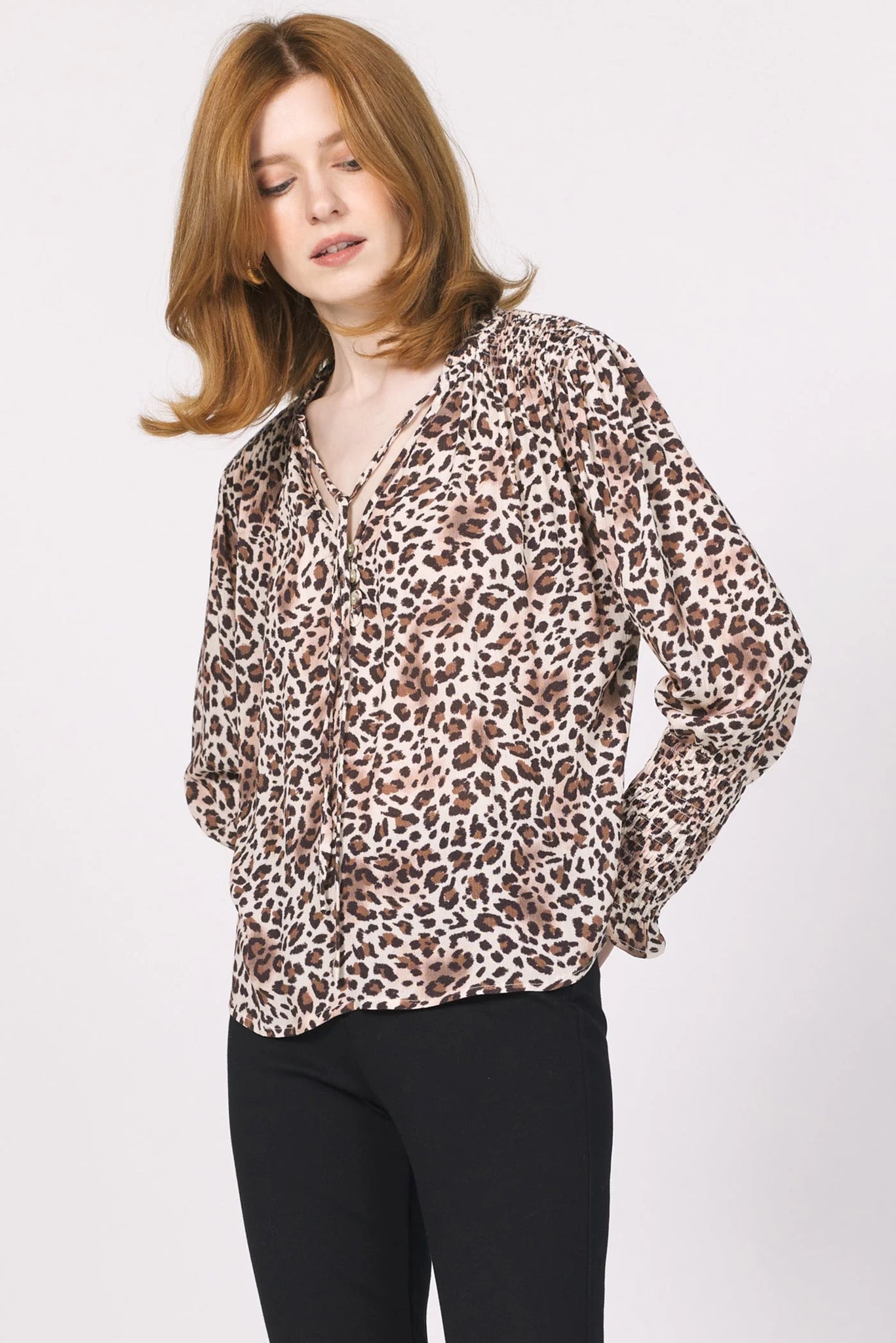 Amabella henley long sleeve top designed for the modern woman, features a front slit with ties in relaxed fitting, bringing a touch of elegance to your everyday look. Its smocked cuff design provides chic styling.