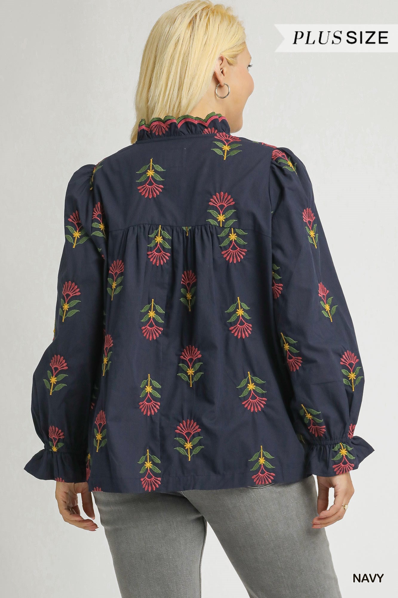 V-Neck, Scalloped Ruffle Trim, Embroidered & Gathered Cuffs, Unlined
