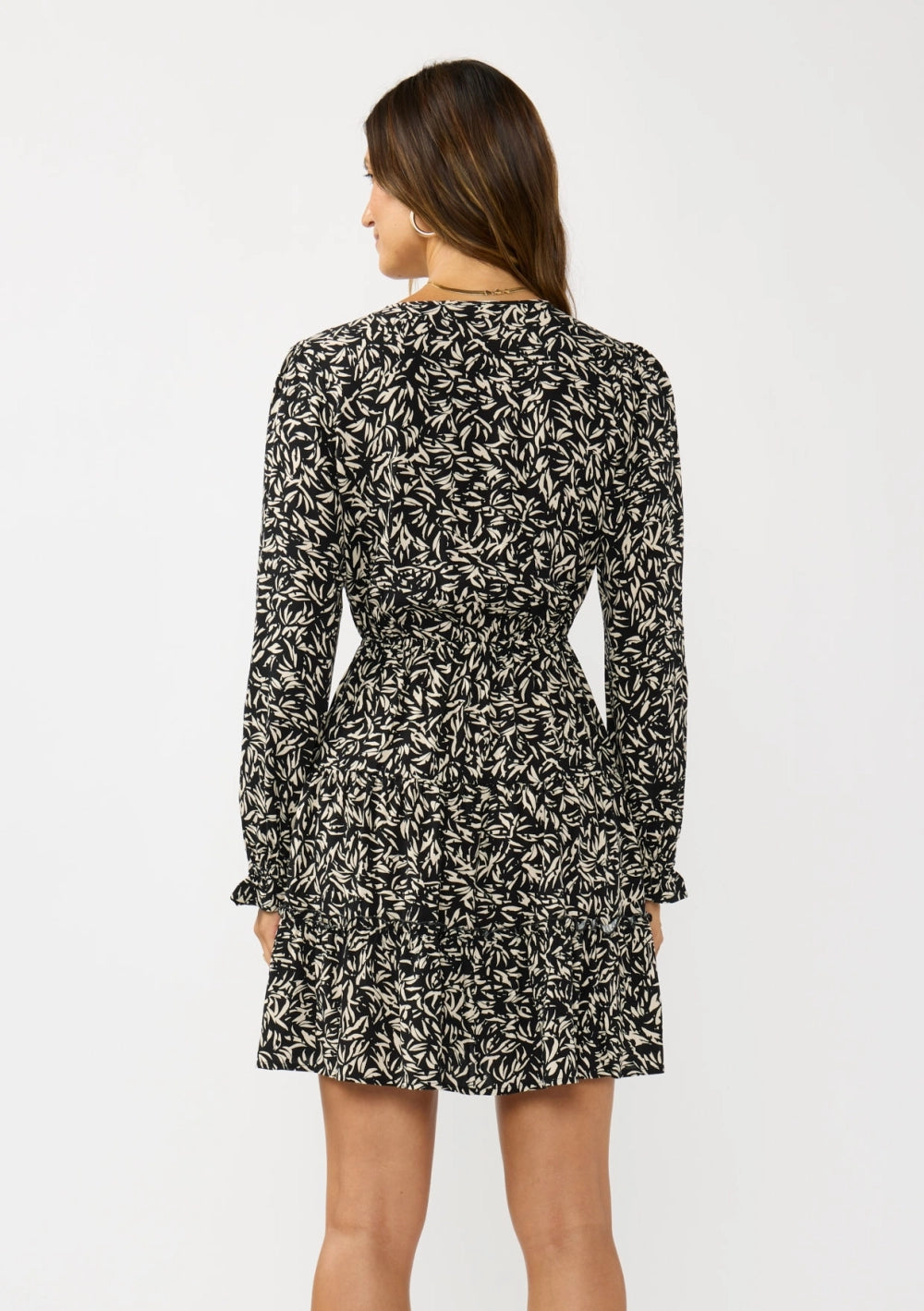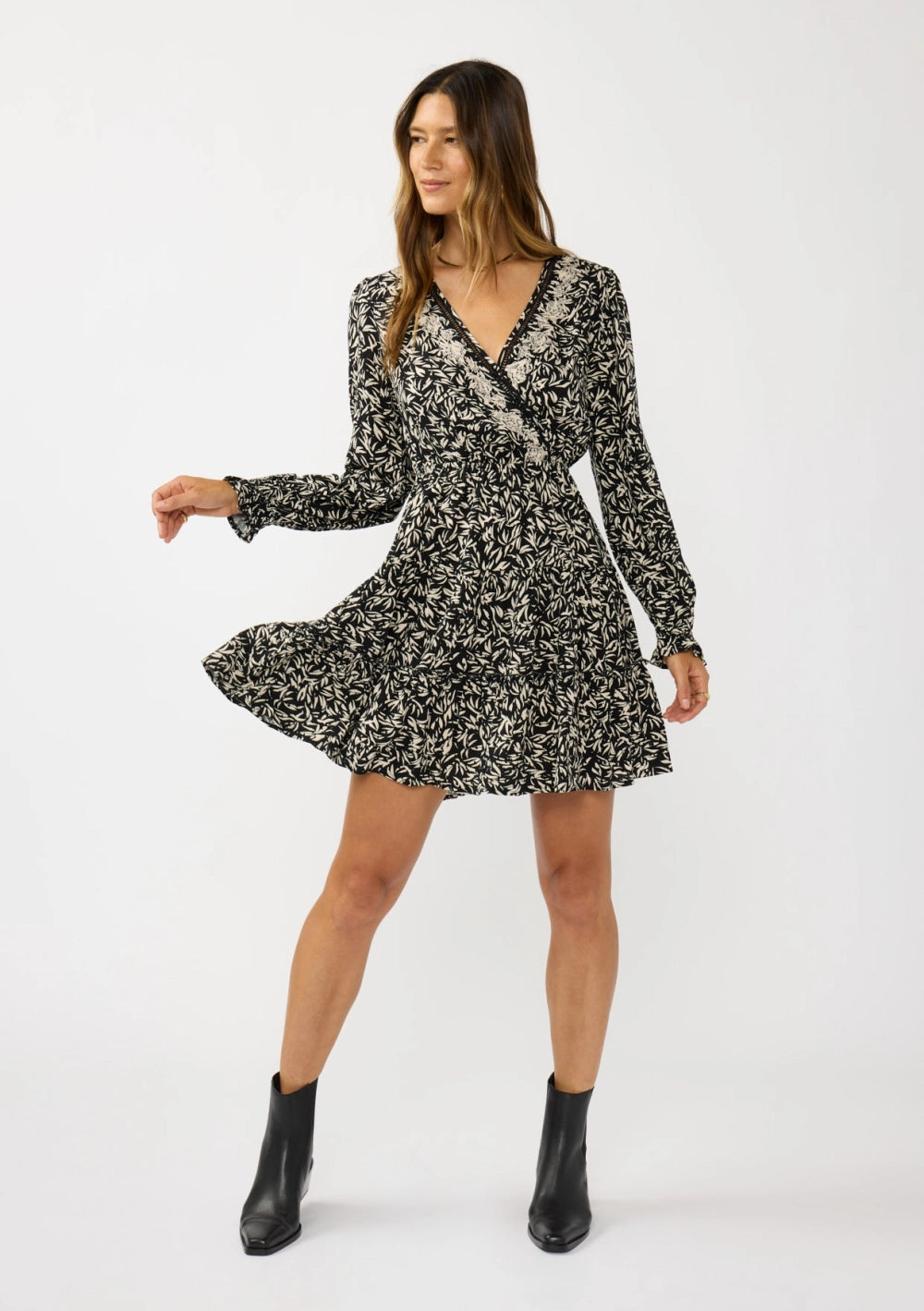 Feminine and full of charm, this fall mini dress is made from lightweight rayon challis in an all-over floral print. The surplice V-neckline, secured with a discreet hook-and-eye closure, is beautifully framed with intricate embroidery and delicate lace trim, leading into long sleeves with softly gathered ruffle cuffs for a touch of romance. An elastic waist creates a flattering shape, while the tiered skirt moves effortlessly, giving the dress a playful yet elegant finish.