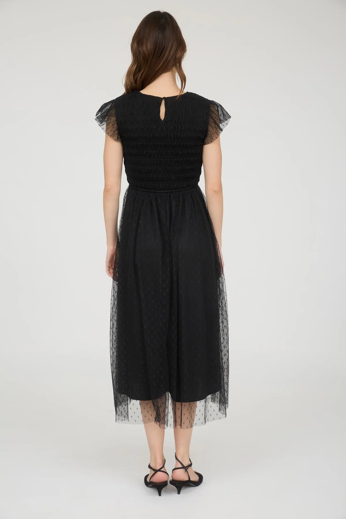 Round Neckline, Short Ruffle Sleeves, Backed Eye Closure, Smocked Bodice, Polka Dot Chiffon Fabric,