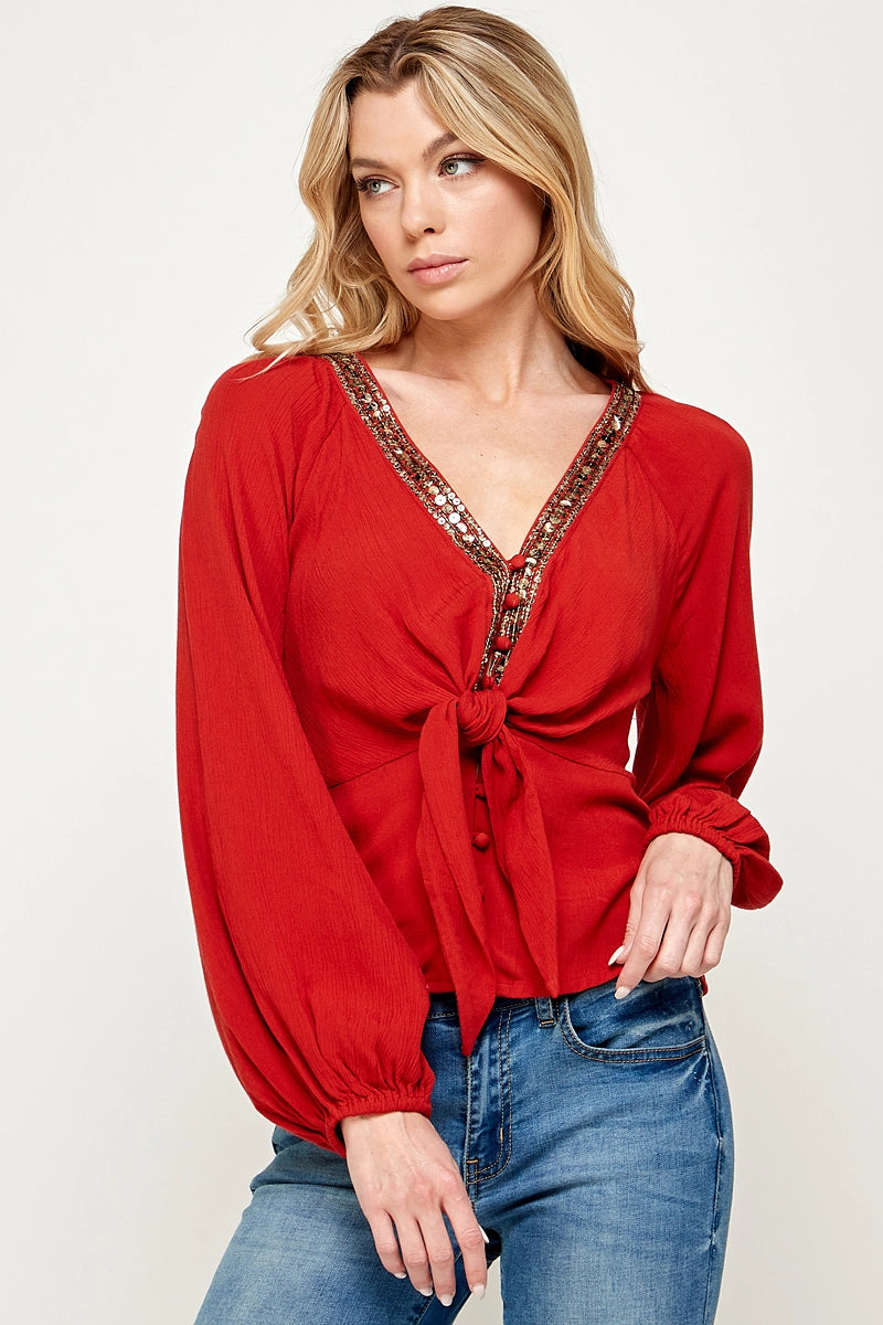 V Neck, Long Sleeve, Front Tie, Sequin Trim,