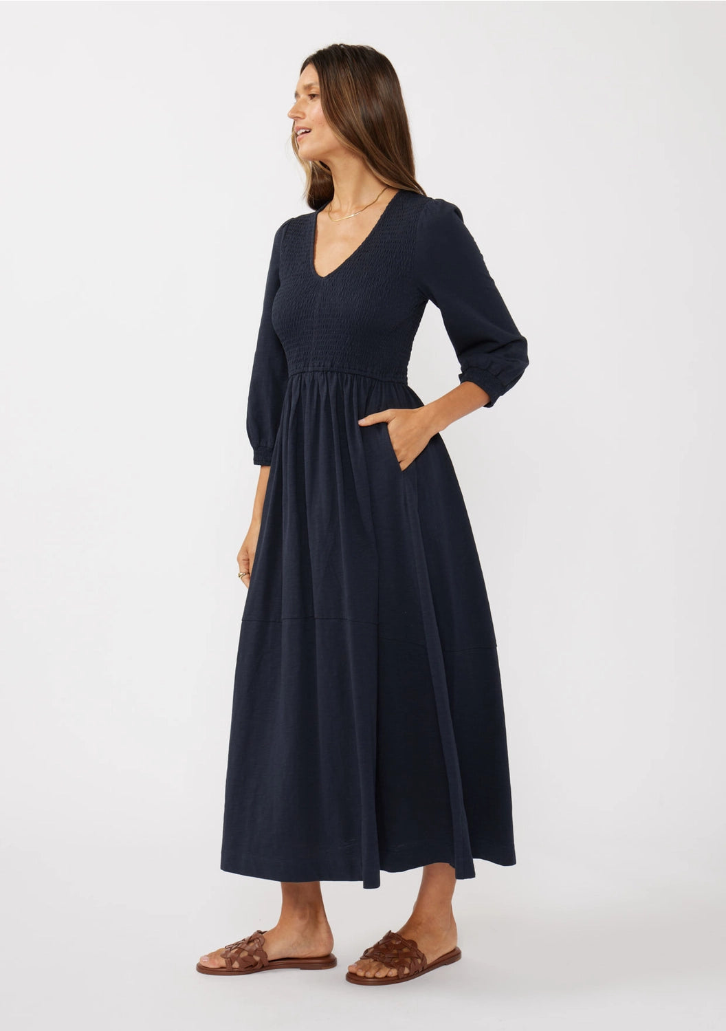 Embrace effortless elegance with this solid-color V-neck smocked slub knit maxi dress, featuring a flattering gathered waist, soft, flowing silhouette, and convenient side pockets. The 3/4 sleeves with elastic cuffs add a touch of sophistication, making it the perfect choice for spring days when you seek both comfort and style.