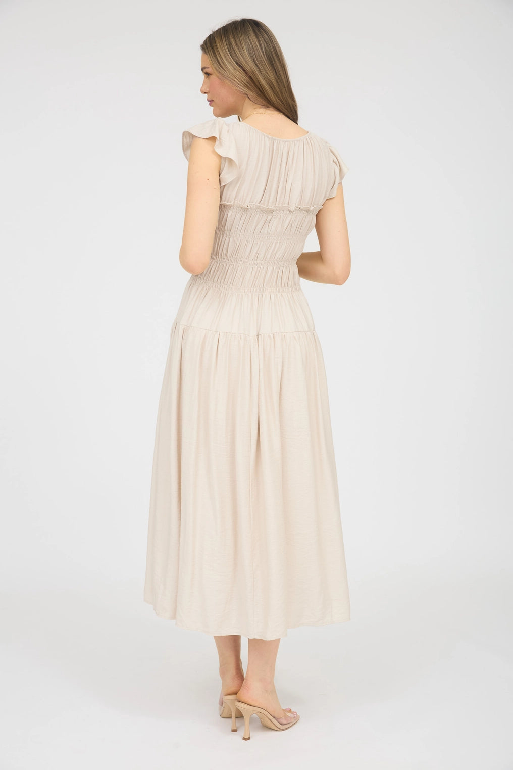 Scoop Neckline, Ruffle Sleeve, Front Tie Detail, Shirred Bodice, Lined