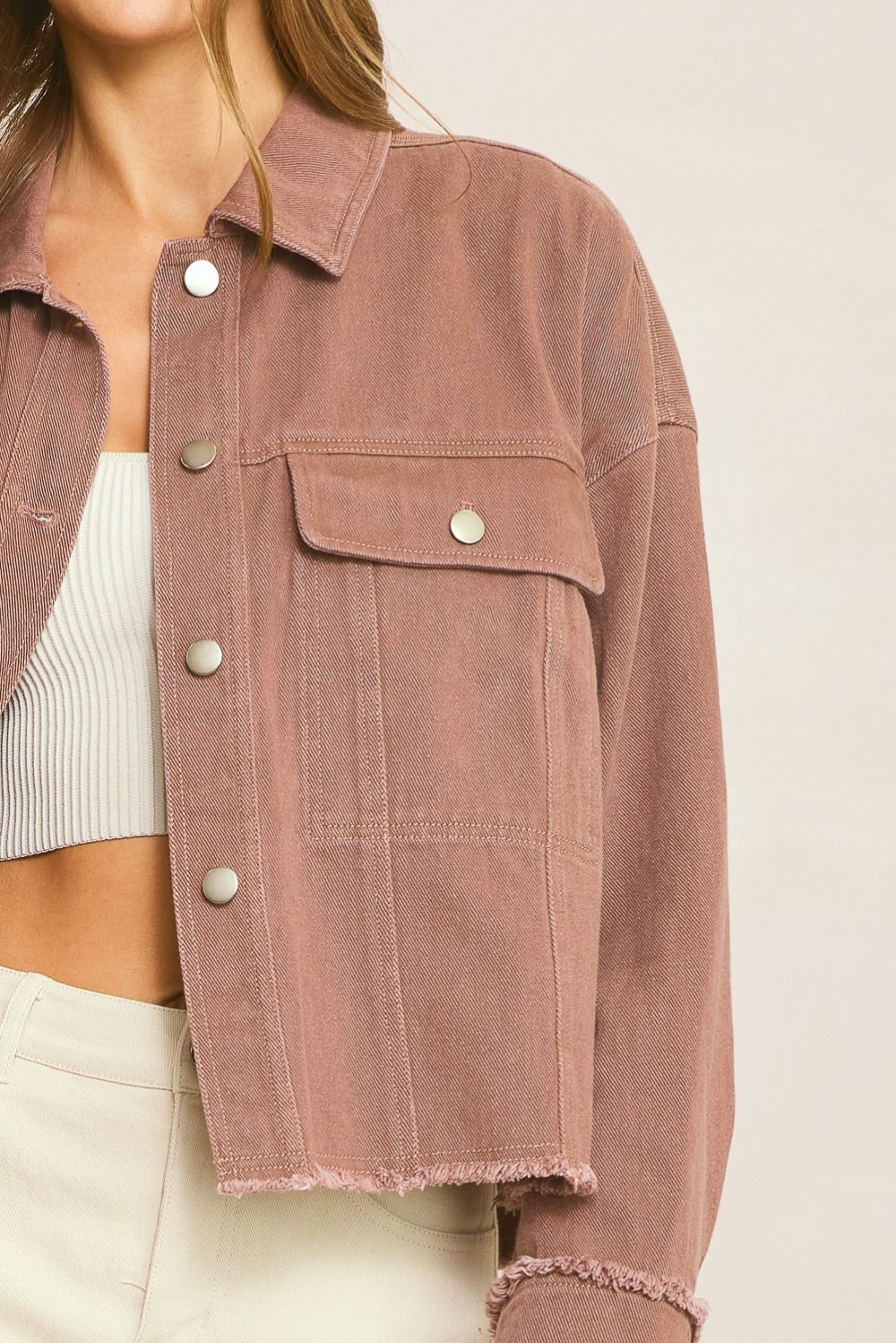 Denim button down collared jacket featuring fringe detail at hem and wrists. Unlined. Woven. Non-sheer. Lightweight.
